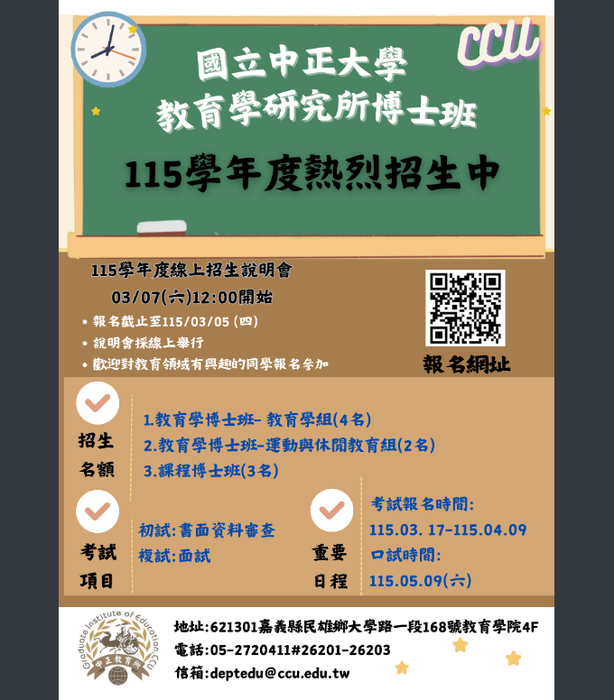 (三)最新消息請洽教育學研究所網址:https://deptedu. ccu.edu.tw/?Lang=zh-tw。